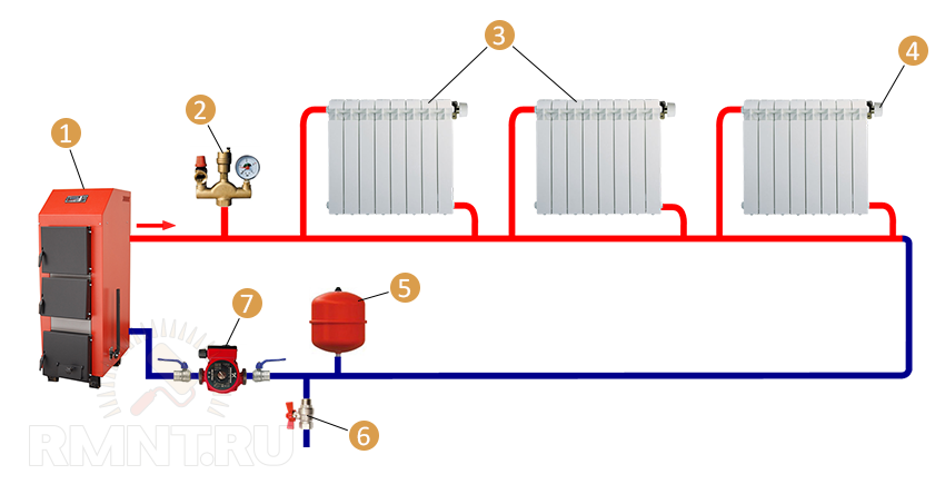 1 — котел отопления; 2 — группа безопасности; 3 — радиаторы с диагональным подключением; 4 — кран Маевского; 5 — расширительный бак мембранного типа; 6 — вентиль для слива и наполнения системы; 7 — насос