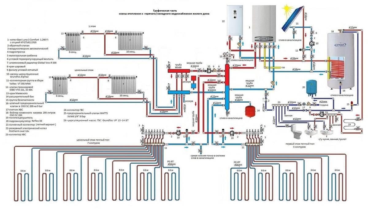 В общую схему отопления встраивается и контуры подготовки горячей воды. Полная схема системы отопления и горячего водоснабжения представлена на рисунке 17.