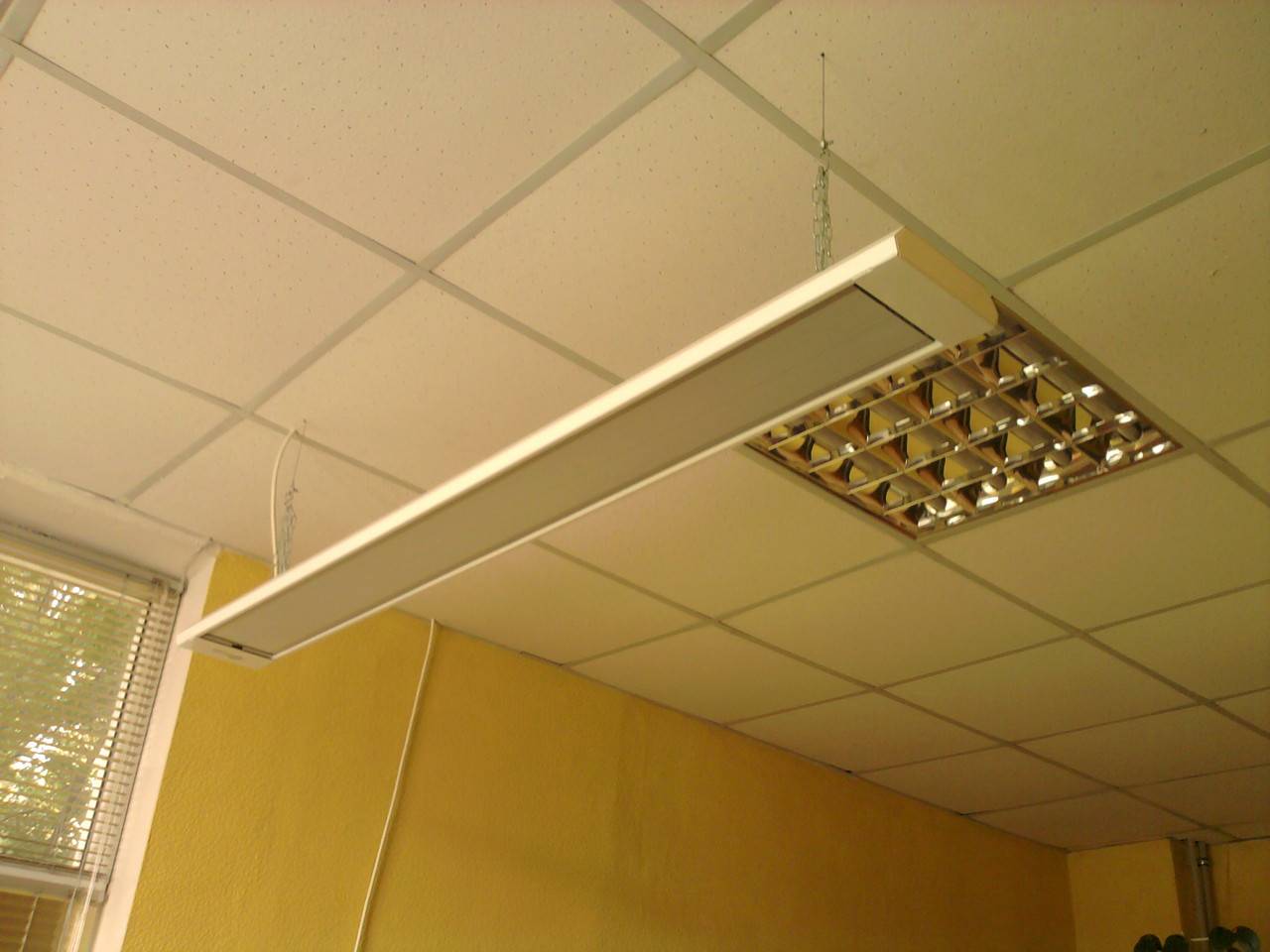 Потолочные обогреватели применяются для обогрева помещений, больших по размеру. Мощность таких приборов — высокая, крепятся они на большой высоте, на подвесах или торсах.
