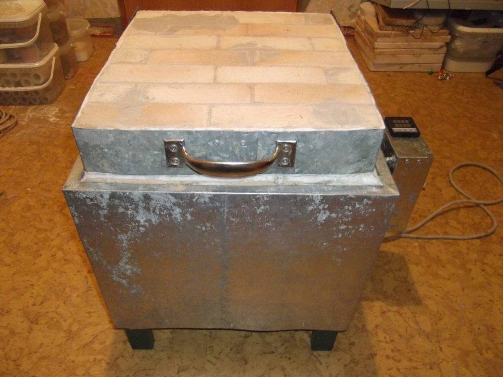 Но газовый агрегат в домашних условиях собрать не получится, поскольку это опасно и запрещено законом. Вариант на угле может работать только с наддувом. Но если есть подобный горн, то проще поместить в него муфель, а не сооружать специальную печь. Электрический вариант позволит контролировать температуру нагрева и применять компактный агрегат даже в квартире (мощность таких устройств около 2,5 — 4 кВт, так что подойдёт обычная розетка с заземлением и надёжным проводом).