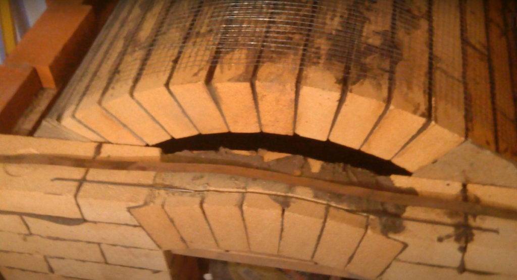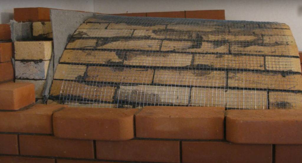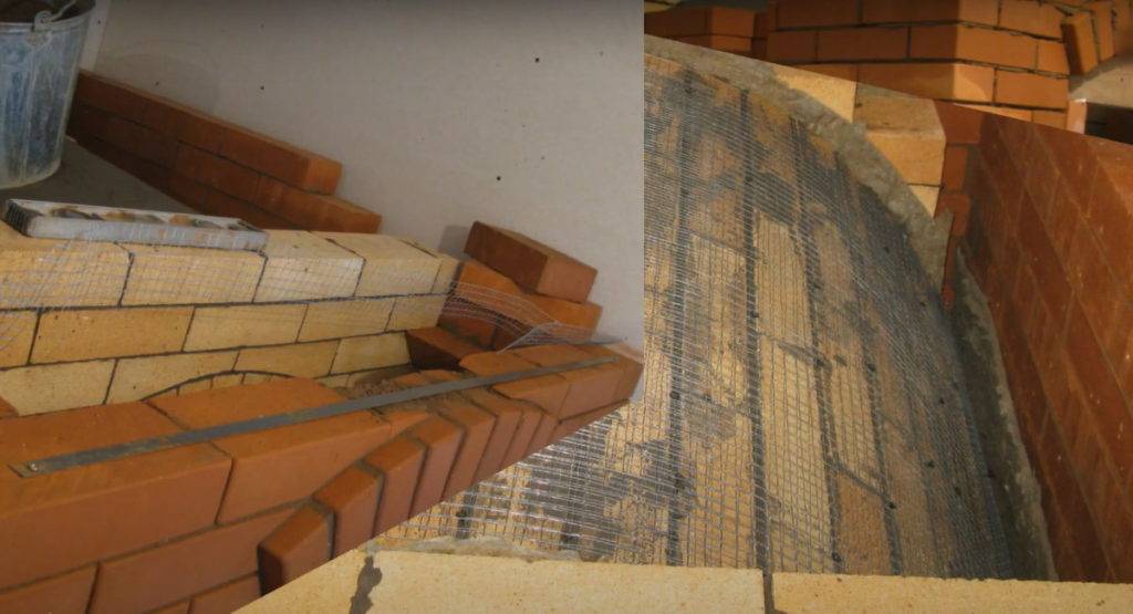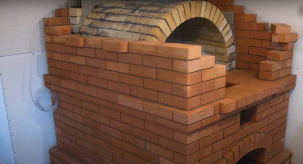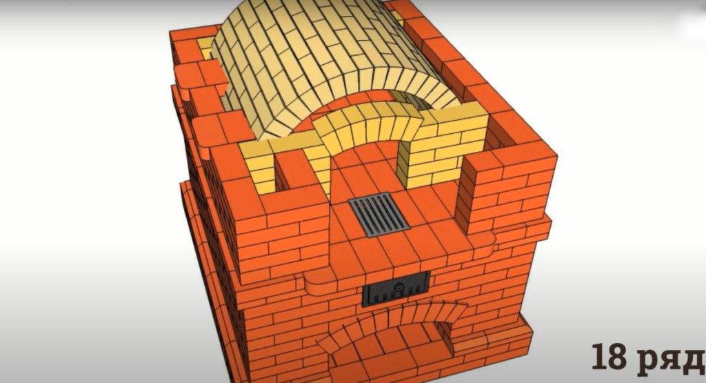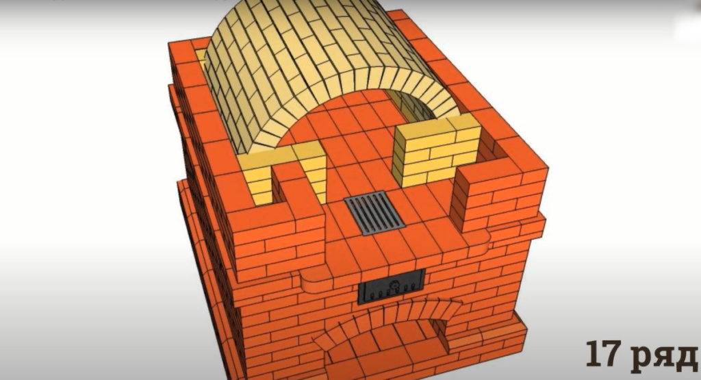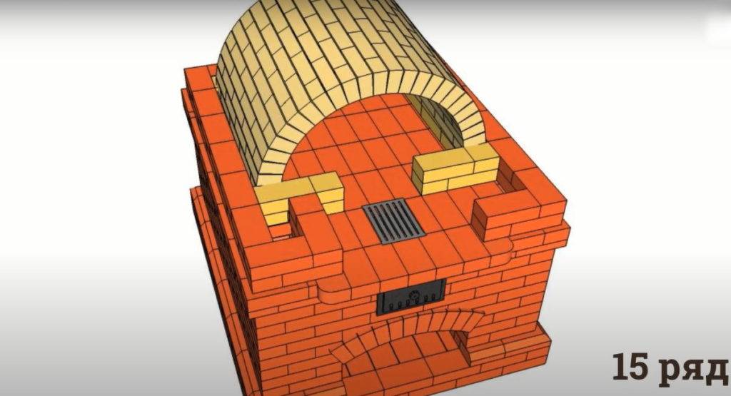На 11-13 ряду формируем дугообразное горнило. Далее по аналогии собираются ряды уложенные в форме дымохода. На необходимых этапах монтируем перекрывающие и задвижные элементы.