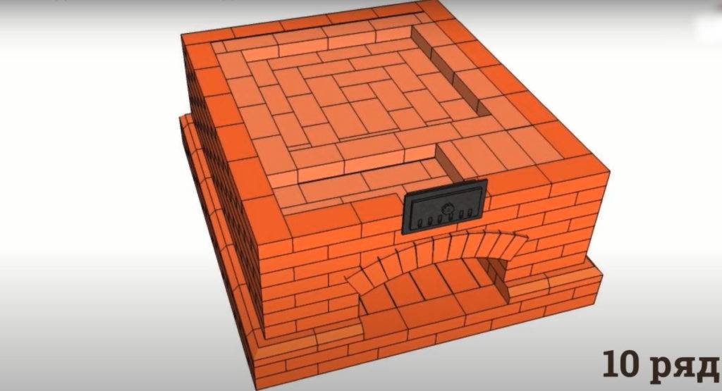 10 слой будет чуть сложнее. Углы выкладываются из трехчетверток. Бока делаются из ложковых полномерных кирпичей, а задник – из тычковых полномерных экземпляров. Впереди кладутся целые кирпичи стычками вглубь в 3 слоя. При такой укладке получается полость, называемая шестком. Пространство между шестком и задней стенкой печи засыпается прослойкой из гравия, песка, глины.
