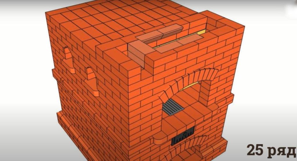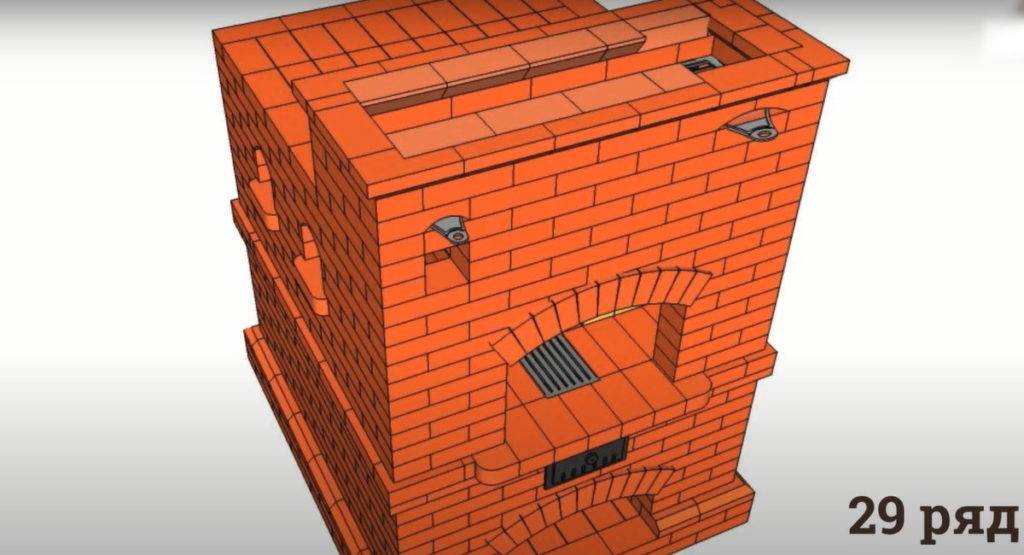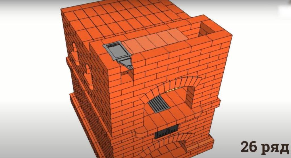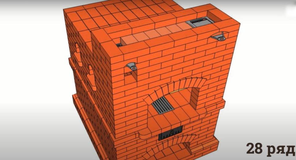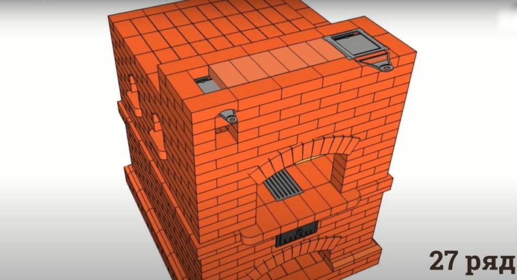 27 ряд. При использовании раствора из асбеста и глины устанавливается общая задвижка. Для этого в кирпичах необходимо высечь углубление для рамки с расчетом на расширение.