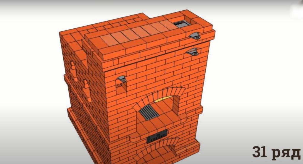 31 ряд. Из 5 кирпичей нужно создать дымовой канал площадью 13×26 см. Кирпичи можно слегка стесать для плавного выхода отходящих газов.