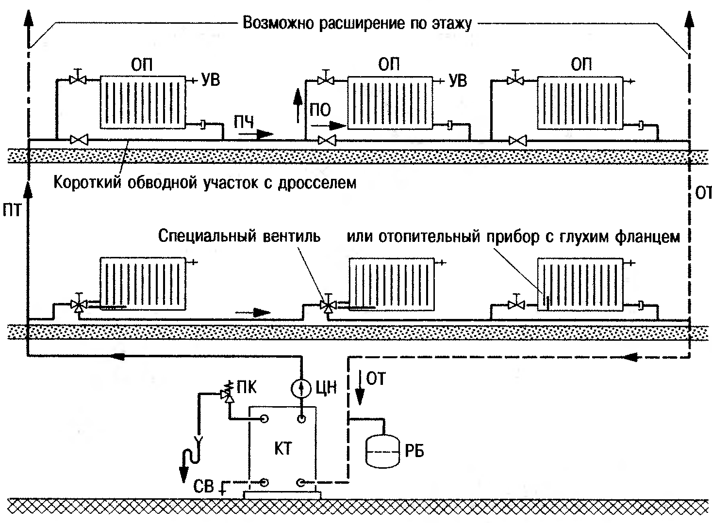 - При однотрубной системе нельзя врезать, что-либо, кроме самих радиаторов, например, теплый пол будет плохо прогреваться сам и мешать прогреву контура радиаторов.