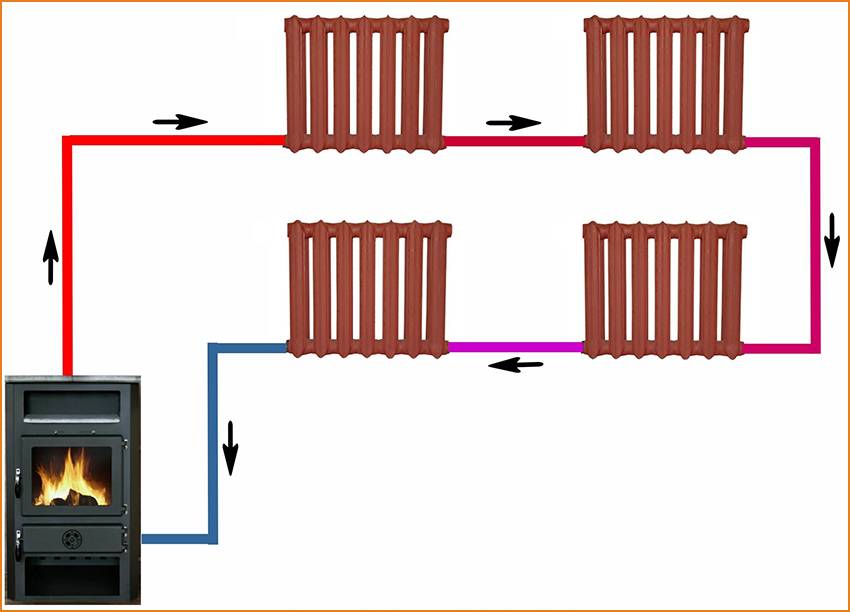 В данном виде отопления отсутствуют разделения на обратные и подающие трубопроводы, поскольку теплоноситель после выхода из котла идет по одному кольцу, после чего опять возвращается в котел. Радиаторы в данном случае имеют последовательное расположение. В каждый из этих радиаторов теплоноситель попадает по очереди, сначала в первый, потом во второй и так далее. Однако температура теплоносителя будет снижаться, и последний в системе отопительный прибор будет иметь температуру ниже первого.
