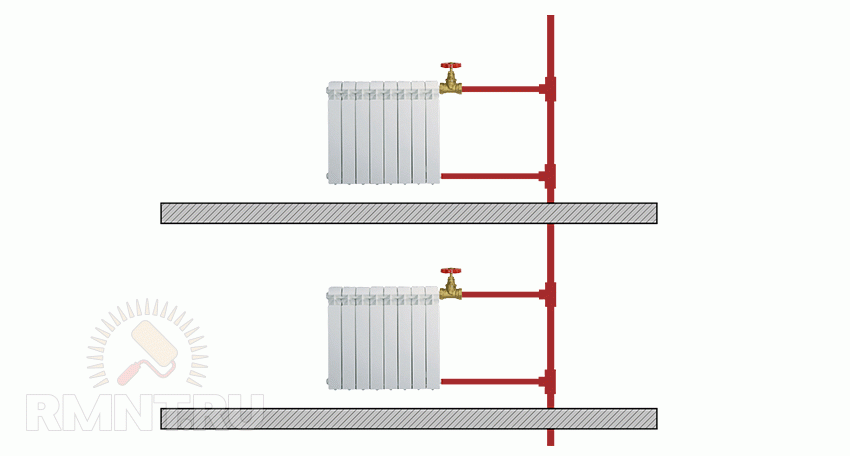 Применяется для многоэтажных зданий. Каждый контур подставляет собой вертикальный стояк, проходящий от чердака до подвала по всем этажам. Радиаторы подсоединяются боковым включением параллельно магистрали и последовательно на каждом этаже.