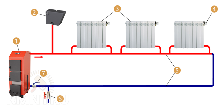 1 — котел отопления; 2 — группа безопасности; 3 — радиаторы с диагональным подключением; 4 — кран Маевского; 5 — расширительный бак мембранного типа; 6 — вентиль для слива и наполнения системы; 7 — насос