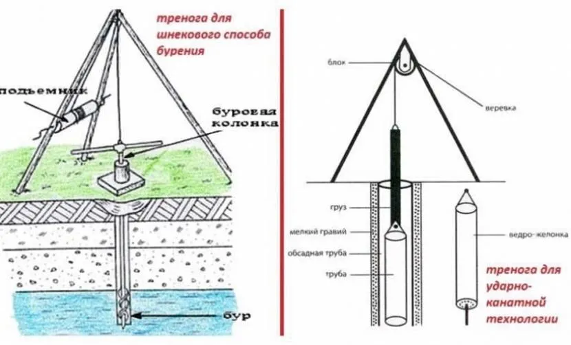 Все что потребуется – это тренога, лебедка с тросом, бур, имеющий наконечник, а также несколько труб.