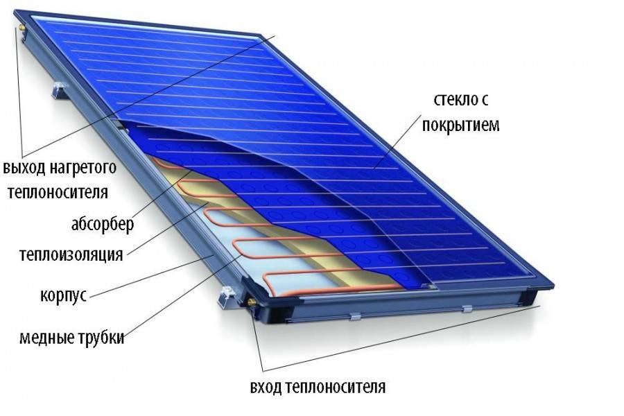 - Плоскими. Это системы в виде прямоугольника, выполненные из прочного материала. Внутри корпуса выложена изоляционная прокладка, поверхность которой накрыта пластиной, абсорбирующей тепло. В углубления пластины монтируются медные трубки, передающие теплоноситель. Корпус закрыт оболочкой со свойством поглощения солнечных лучей и защитным стеклом.