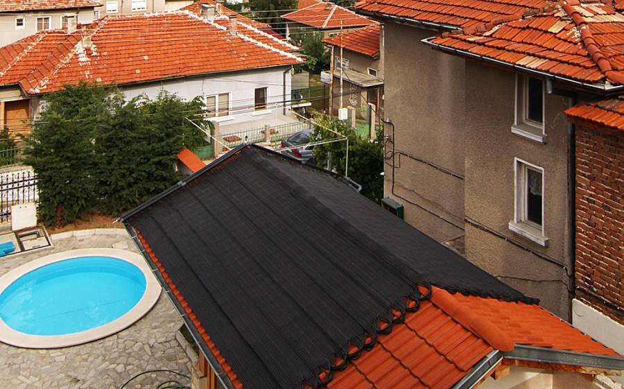 - Открытые. Представляют собой плоские продолговатые емкости черного цвета, наполненные водой. Она нагревается от солнечного тепла и может поддерживать температуру воды в открытых бассейнах, летнем душе и т.д. КПД таких устройств крайне низок, поэтому их можно использовать только в летнее время