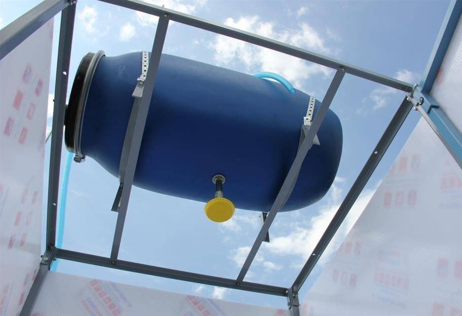 - Более сложная конструкция представляет собой небольшую кабинку из подручных материалов, к примеру, натянутого на металлический или деревянный каркас брезента, с выведенным наружу баком, который может нагреваться на солнце. Баки преимущественно используются пластиковые и металлические.