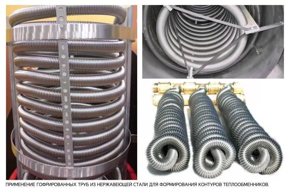 - Лучший материал для бака теплообменника – сталь «нержавейка», которая выдерживает высокие температуры и резкие перепады.