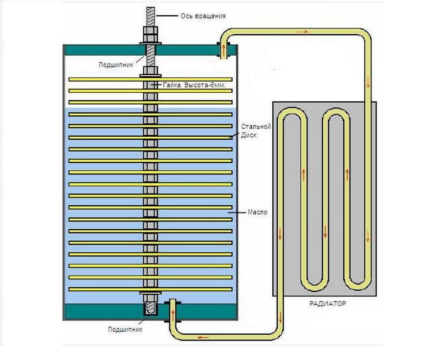 Если все сделано правильно, ось с дисками начнет раскручиваться, разогревая находящееся внутри устройства масло. Горячий теплоноситель станет перемещаться через верхнее отверстие по трубе в радиатор отопления. Остывшее масло будет возвращаться в корпус теплового насоса по нижней трубе для повторного нагрева.