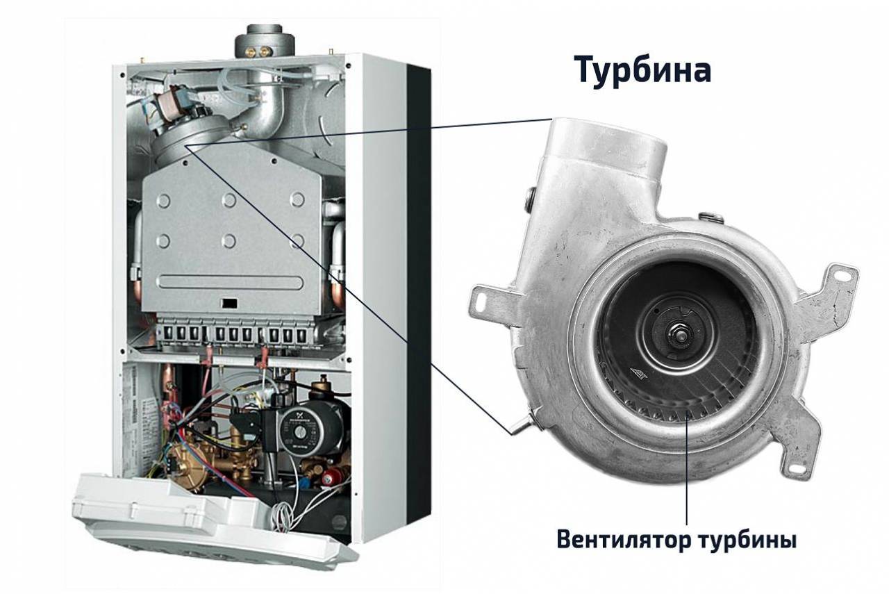 Вентилятор турбированного котла не может работать без электроэнергии Котельное оборудование со встроенной турбиной имеет следующие преимущества: