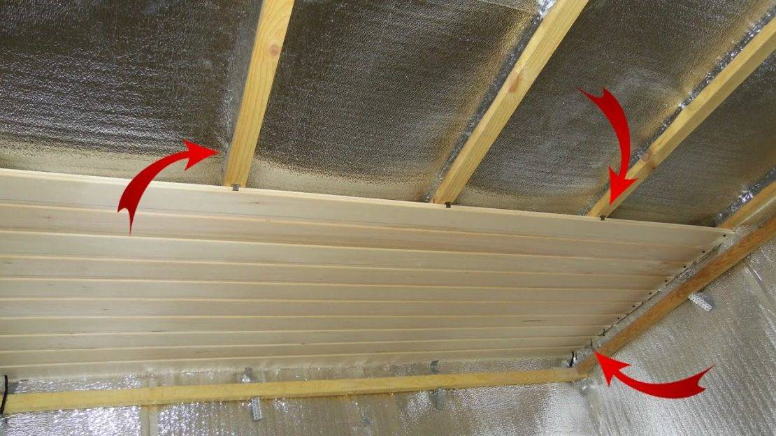 Для отвода конденсата предусматривается выпуск фольгированного материала с потолка на стену, а со стены — на пол. Поверх фольгоизола крепятся рейки толщиной не менее 3 см. Они выполняют две функции: служат обрешеткой для финишной облицовки и образуют воздушный зазор между фольгой и вагонкой. Зазор важен для того, чтобы исключить прямую теплопередачу от вагонки через слой алюминия.