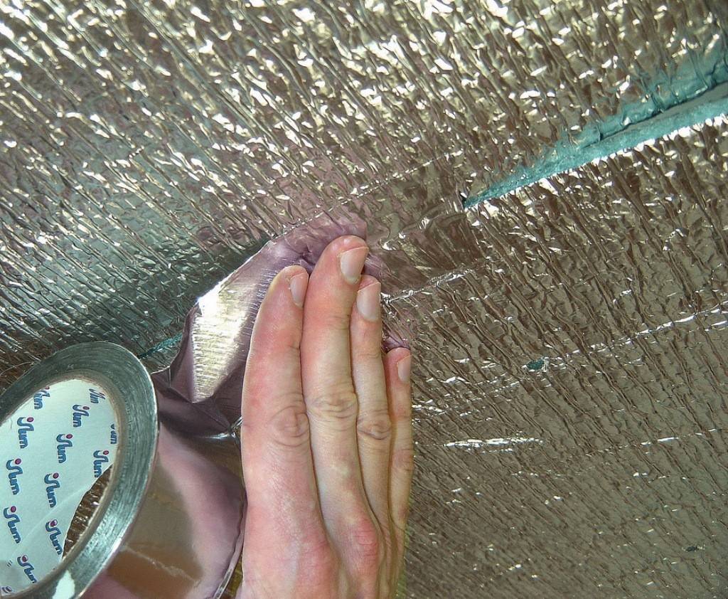 Монтаж осуществляют на клей, строительный степлер, двухсторонний скотч. Листы крепят встык, места соединений герметизируют алюминиевым скотчем. Нужно уложить материал белой стороной вниз, фольгой наружу.