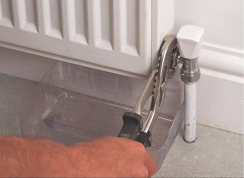 - Разводным ключом аккуратно открутить на несколько оборотов крепление батареи к трубе, чтобы вытекшая жидкость попала в таз.
