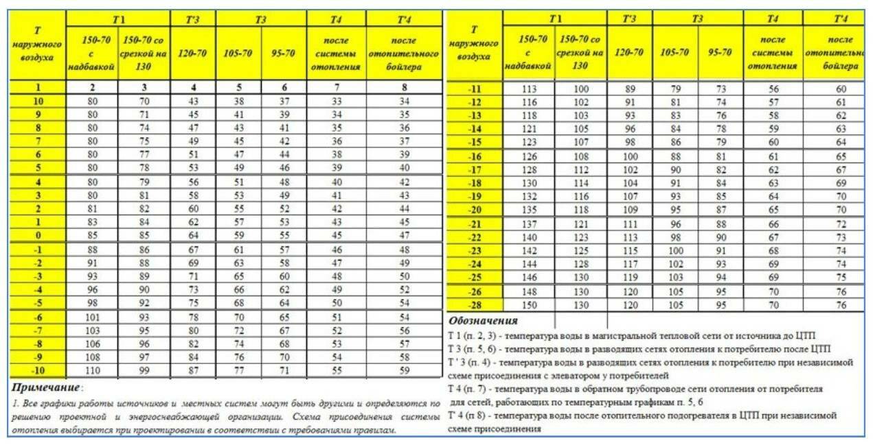 - Применение таблиц позволяет бережно использовать арматуру, оборудование и трубы в зависимости от материала их изготовления, срока службы, физических характеристик и размеров. К примеру, для изношенных теплосетей подбирают щадящую эксплуатацию в режиме отопления 95 70.