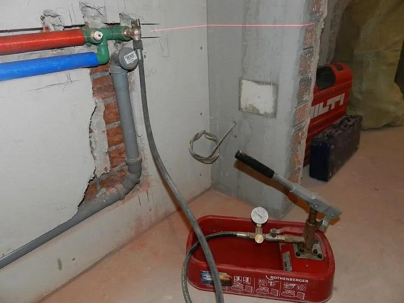 Работы выполняются при помощи нагнетательного насоса. Систему необходимо продуть или промыть под повышенным давлением, включая котел через 10 минут. Опрессовка позволит выявить утечку, о которой свидетельствует снижение рабочего давления.