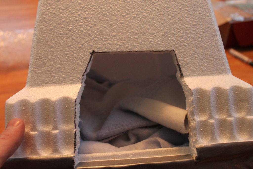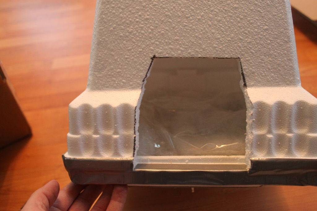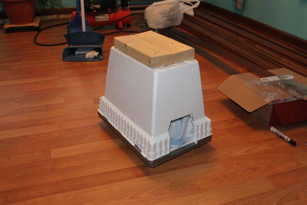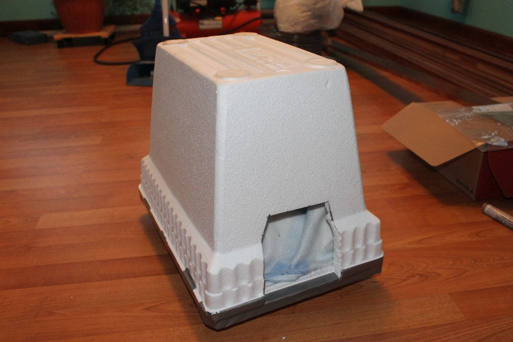 Большую коробку можно уменьшить. Утеплить стены и пол лучше пенополистеролом, по сравнению с пенопластом он более долговечен, лучше сохраняет тепло и меньше набирает влаги.